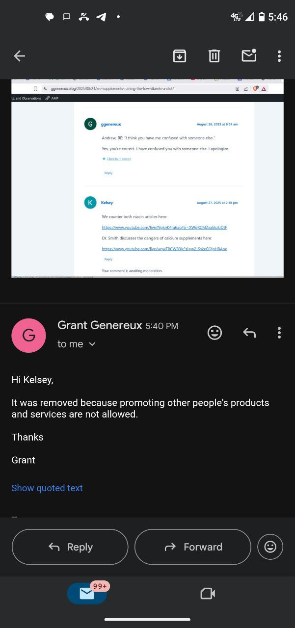 Because Kelsey attempted to submit my recent videos on calcium and nicotinic acid on Grant’s recent article as a comment, to help set the record straight. Grant himself CENSORED (denied) the comment.